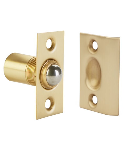 Ball catches are installed in the top, bottom and/or side of the door to hold them closed. Each Solid Brass Ball Catch is packaged with matching finish screws. Used in conjunction with dummy hardware. Supplied with strike. Made of solid brass.