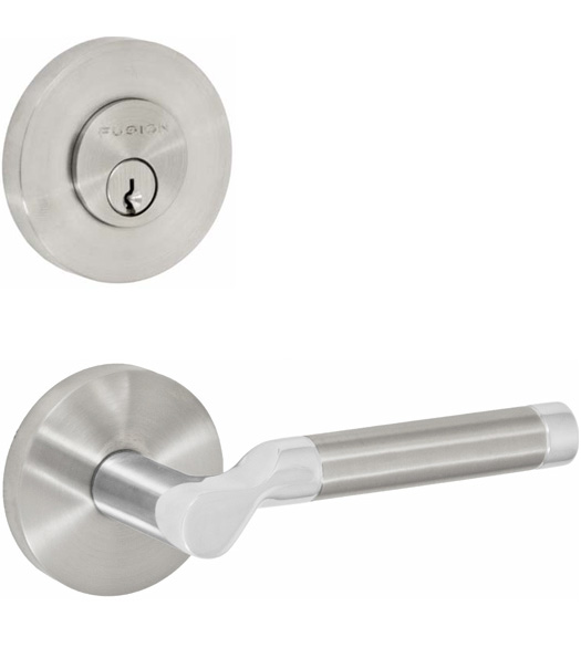 This passage lever and single cylinder deadbolt set features the clean lines and sleek appearance that is characteristic of the contemporary aesthetic--an appearance that is maintained by the concealed screw assembly. A Fusion made entry set, it is both chic and streamlined. Made for heavy duty security, this stainless steel deadbolt and lever entryset has a limited lifetime warranty. It is available in Brushed Stainless Steel and Polished Stainless Steel finishes. It has an optional 2-3/8" or 2-3/4" backset.