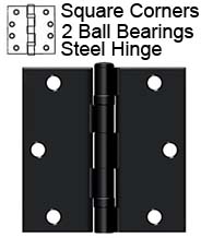 3-1/2" x 3-1/2" Square Corner Ball Bearing Hinges, 0.085" thick durable Steel. Package includes a pair of hinges with wood mounting screws. Ball bearing offer smother door action and longer life. Available in 5 different finish colors.