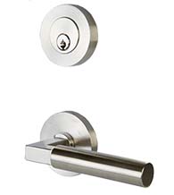This is a combo pack for a front door. the set included a Single Cylinder Disc Deadbolt and a Passage Function Hercules Lever with concealed screw mounting. The Modern Stainless Steel Combo Pack comes with everything you'll need to update any door where a keyed lock might be required. The Disc Single Cylinder Deadbolt with Hercules Lever is made stainless steel with a satin stainless steel finish.