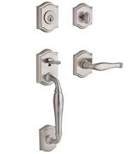 Available in a single, double, or dummy cylinder function, the Westcliff Entrance Set is part of Baldwin's Reserve Collection. As such, it has a 25 year finish warranty and a lifetime manufacturer warranty. Choose from beautiful finishes including satin nickel (pictured) as well as polished brass. The Westcliff Arched Handleset has matching arched interior trim, just select one of 3 available knobs or 3 levers. Made to fit in standard pre-drilled doors, this entryset fits doors with thicknesses of 1-3/8 inches to 2-1/2 inches. It has an adjustable latch for backsets of 2-3/8 inches or 2-3/4 inches.