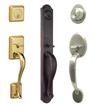 Entry door handlesets with modern, traditional and contemporary styles available in many different beautiful finish choices. Most handlesets are available in Single Cylinder (Keyed outside with Thumbturn inside), Double Cylinder (Keyed on both the outside and inside) and Dummy (Non-Locking and Non-Latching, used on french doors).