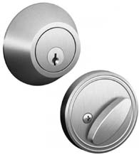 This single cylinder deadbolt made by Schlage will fit all standard door cutouts. It has an adjustable latch to fit 2-3/8 inch or 2-3/4 inch backsets; and it will fit door thicknesses ranging from 1-3/8 inches up to 1-3/4 inches. An ANSI Grade 3 deadbolt, it is operated by a key on the outside of the door and by a thumbturn on the inside of the door. Available in 8 finishes with a 5 year finish warranty and a lifetime mechanical warranty.