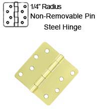 Residential Grade 0.085" thick, 4" x 4" x 1/4" Radius Corners, Non Removable Pin, available in 8 different finishes. Package includes a pair of hinges, matching steel flathead, Phillips screws. Non-removable (NRP) hinges are normally use on out-swing exterior doors for security. Utilizes zig-zag screw hole pattern for use with wood doors.