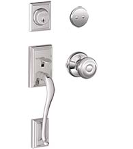 The traditional design of Schlage's Addison handleset features a molded edged and square mounts. This product is just for looks. It does not lock or latch. It is most often used as a pull to match trim on the inactive side of a double door. It is crafted out of solid brass and features a very easy installation.