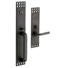 Baldwin's Pasadena Handleset is strongly reminiscent of southwest decor. The textured plate and square cut-outs give it a rustic look that is unique to the 6944 door entrance set. This mortise handleset will fit 1-3/8 inch or 1-3/4 inch door thicknesses and with backsets of 2-1/2 inches or 2-3/4 inches. It is available with a dummy set, a single cylinder, or a double cylinder function.