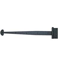 The 17-3/4 Inch Spear Tip Heavy Strap Hinge grants an old world charm to any woodworking project, gate, shutter, entry door, or garage door. Made with a smooth iron finish, this strap hinges feature a spear shaped mounting tip. When installing 3 hinges on a door or gate, these strap hinges are suitable for doors 1-3/8 inch thick and 32 inch wide up to 90 pounds. The smooth iron finish is typical of early American styling, with a flat black appearance which simulates the hardware as it was originally forged.